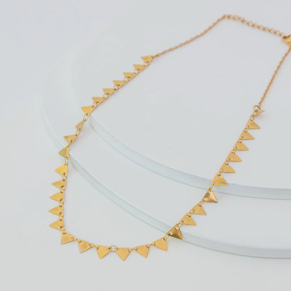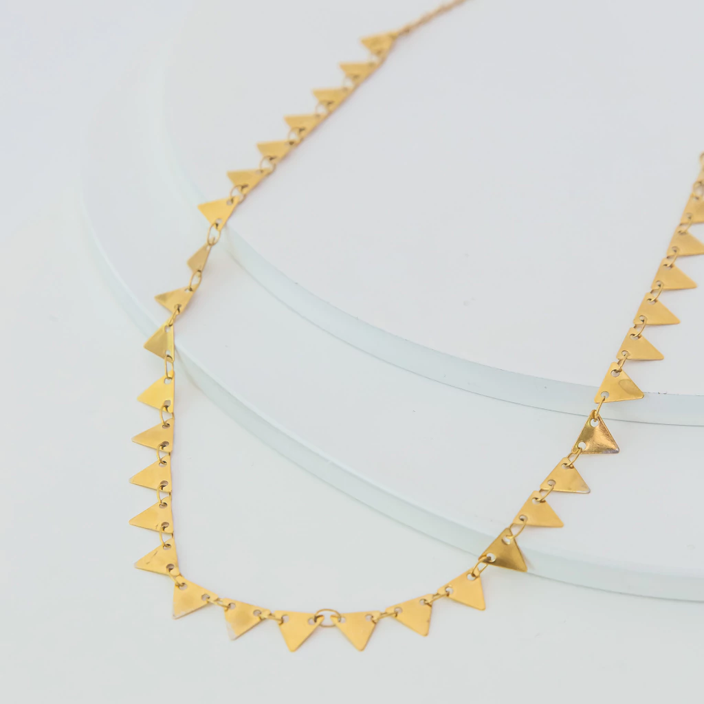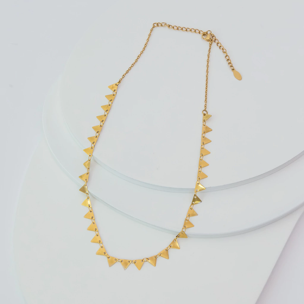 O Colar Dourado Triângulos em Aço Inoxidável é a escolha ideal para quem busca modernidade e estilo em um único acessório. Seu design geométrico delicado cria um visual sofisticado e atual, perfeito para ser usado sozinho ou em combinações de colares.